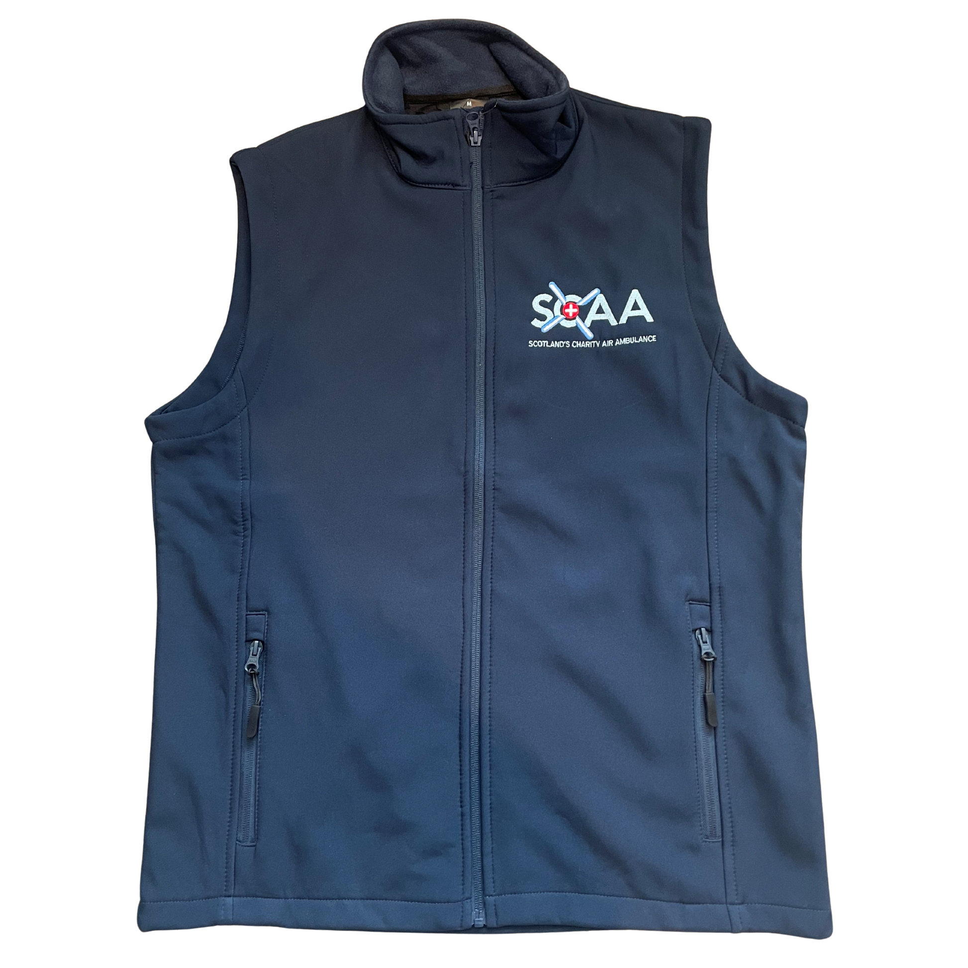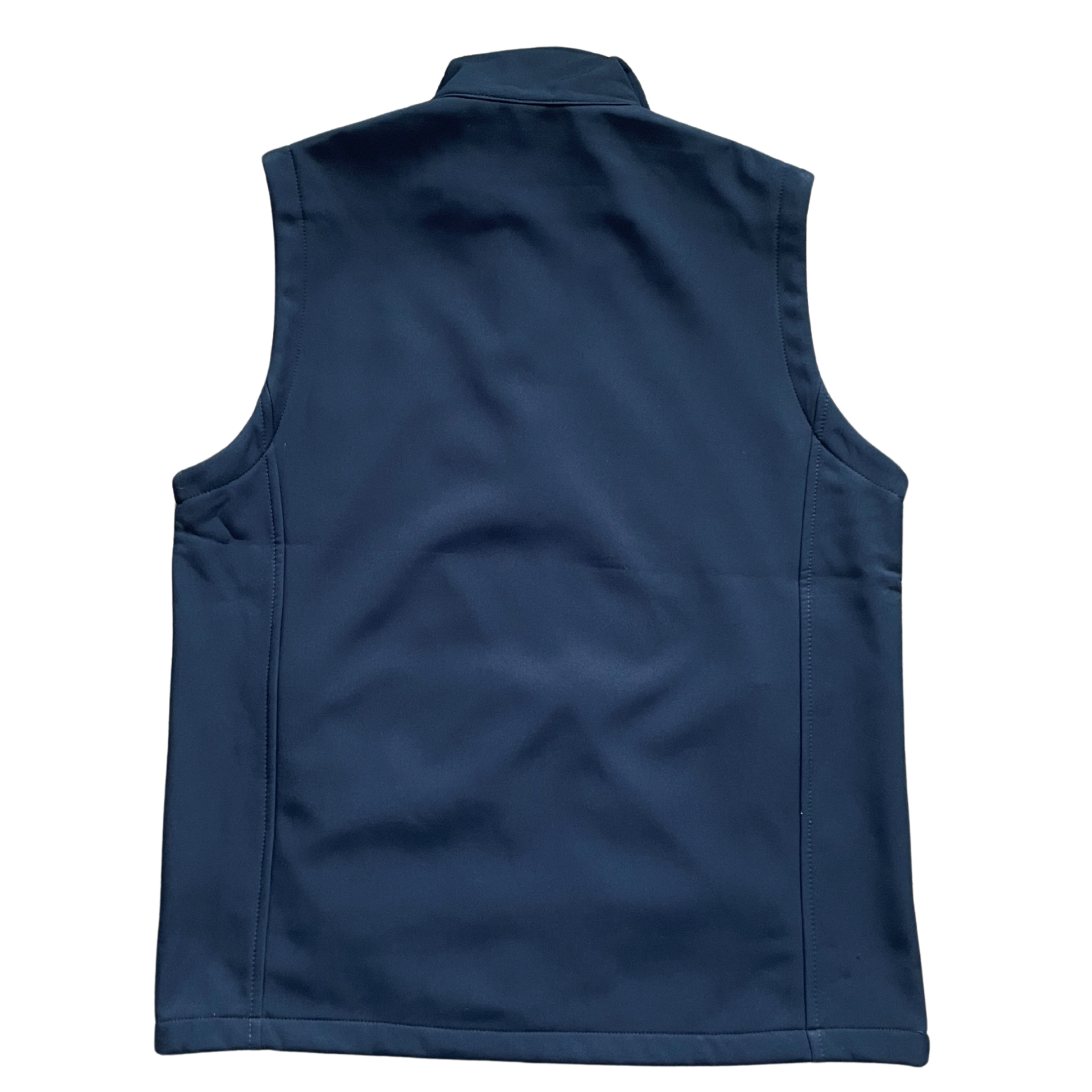 Navy two layer gilet, polyester soft shell outer and micro fleece inner layers.