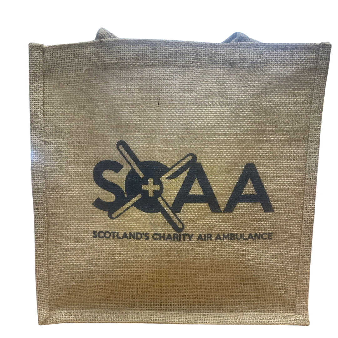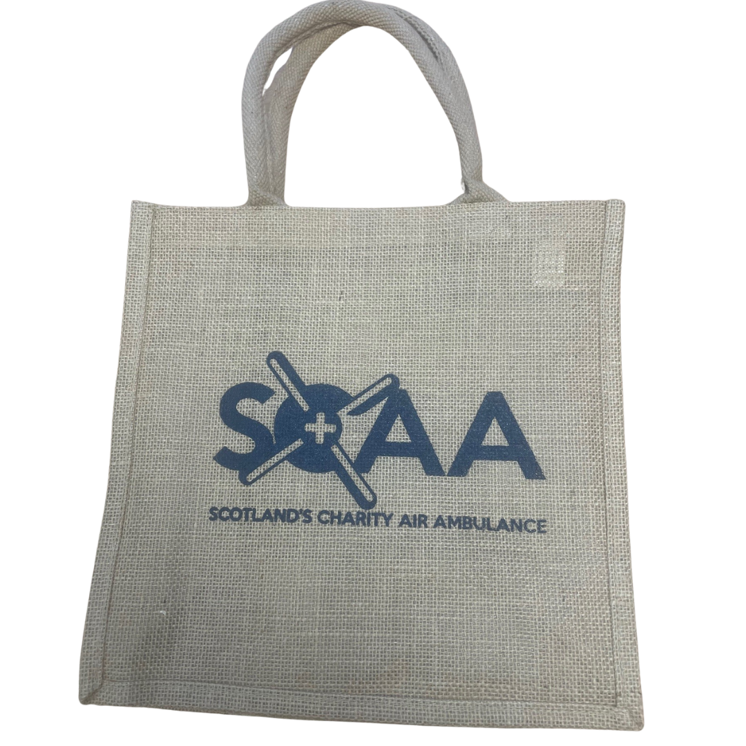 Small jute bag featuring SCAA logo made of natural jute.