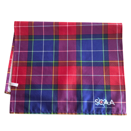 Cotton tea towel featuring SCAA's tartan, with a convenient hanging loop.